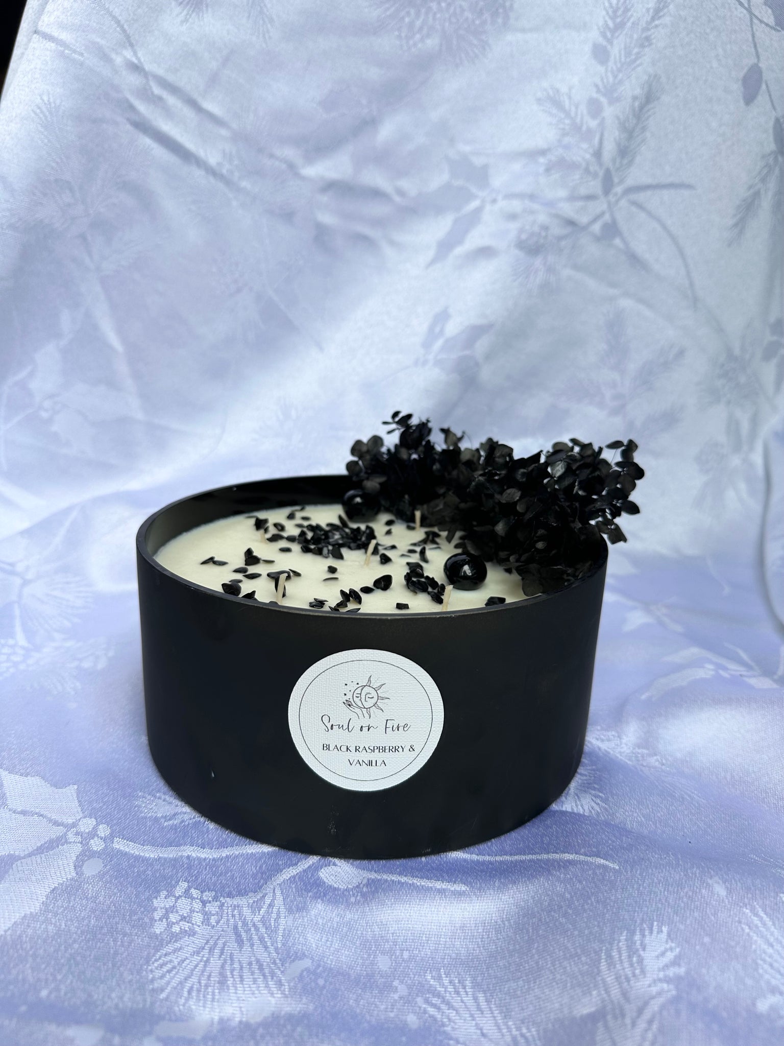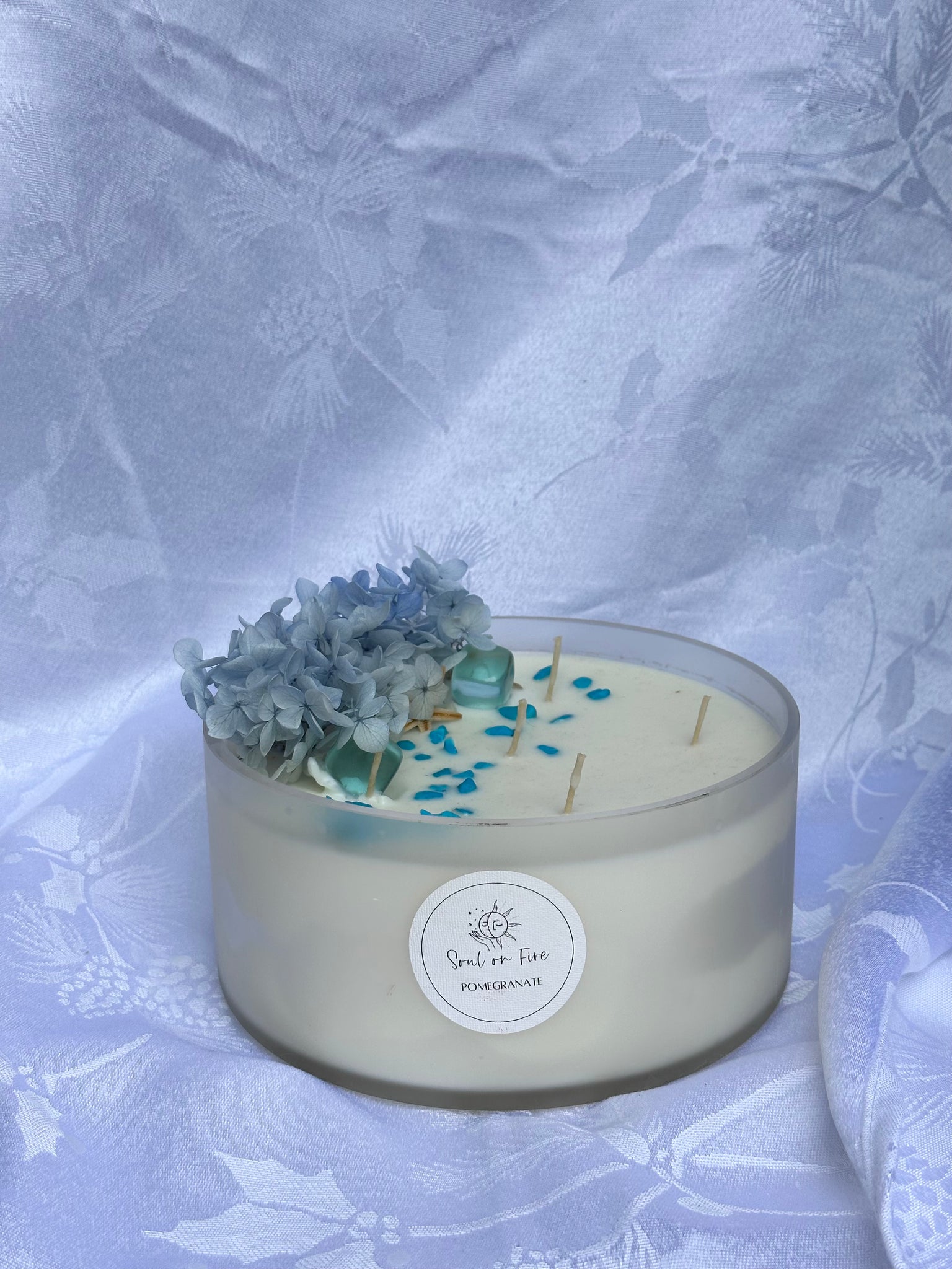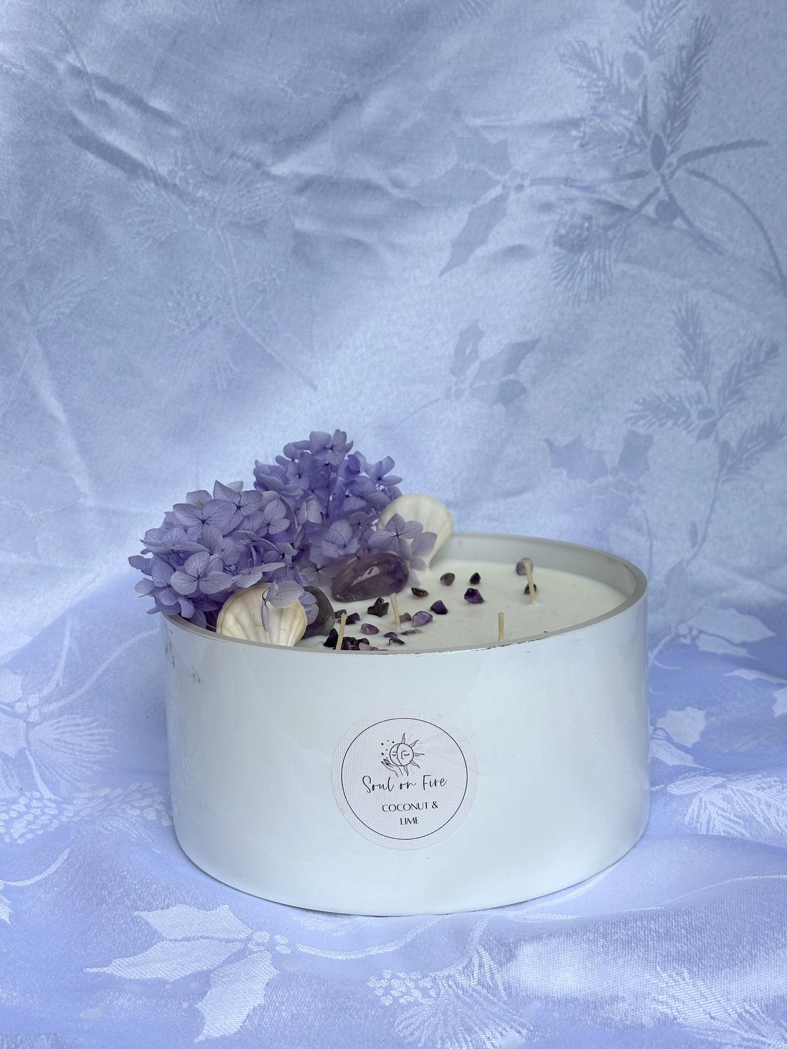 The ultimate statement piece. Our candle bowls hold a generous 1.7kg of soy wax, 6 wicks having a burn time of 150+ hours. These are hand poured and hand decorated with crystals and dried botanicals.